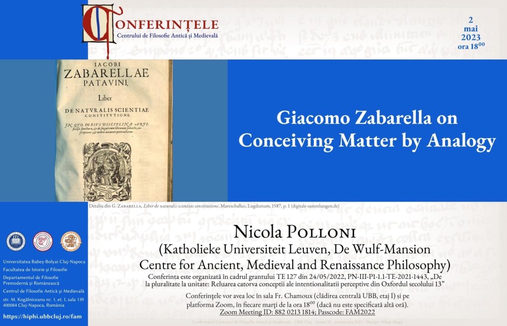 Elena Baltuta kindly invited me to give a lecture at the Babeș-Bolyai University of Cluj. It is going to be my first trip to Romania and I could not be more excited. Moreover, I am going discuss an author that is relatively new to me, Giacomo Zabarella (even though I am going to analyse an issue that I know fairly well: the conceivability problem about prime matter). Much fun ahead!